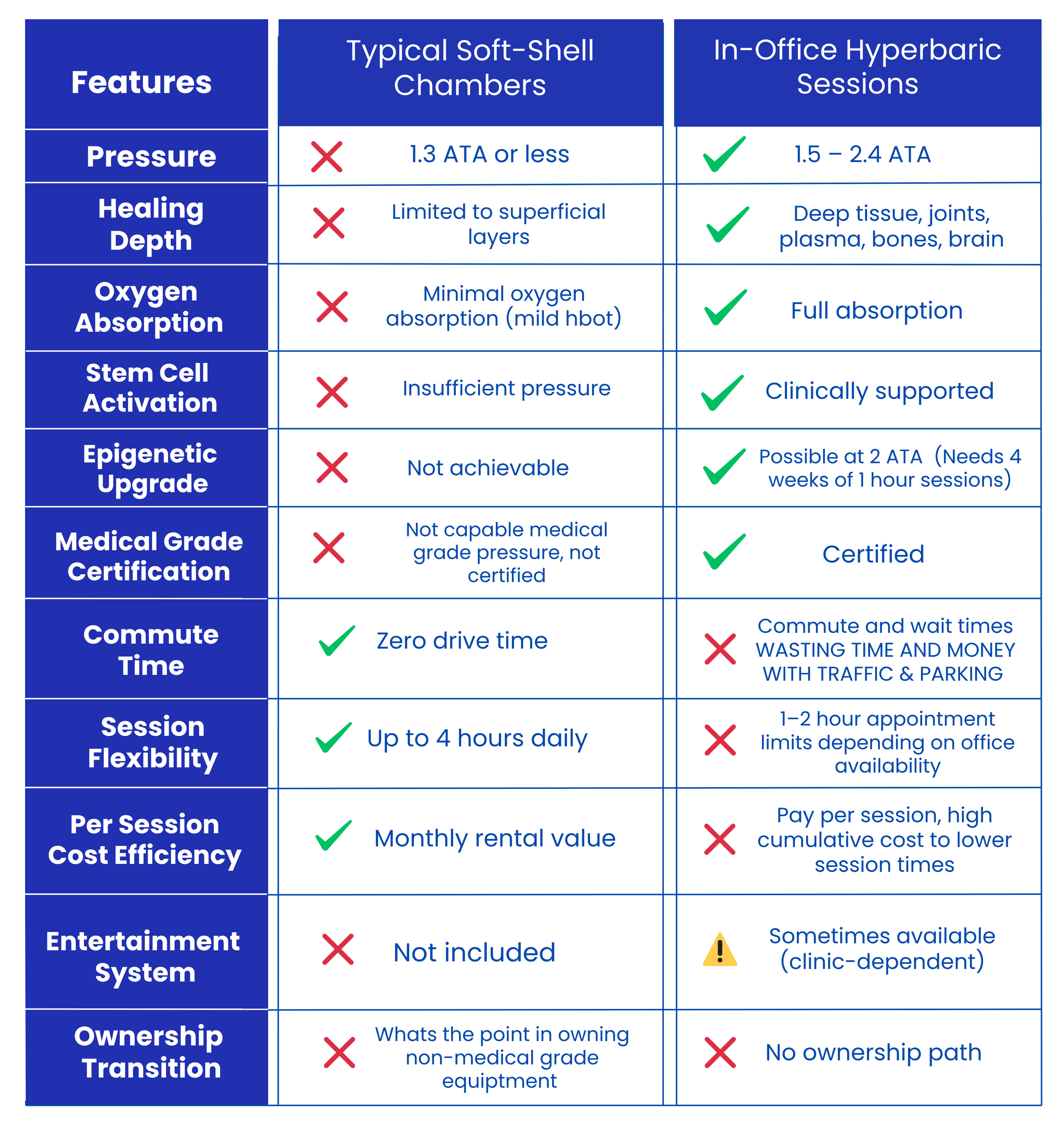 Soft-shell HBOT systems are often marketed as wellness tools — but without sufficient pressure, oxygen uptake remains minimal, and results are dramatically limited.