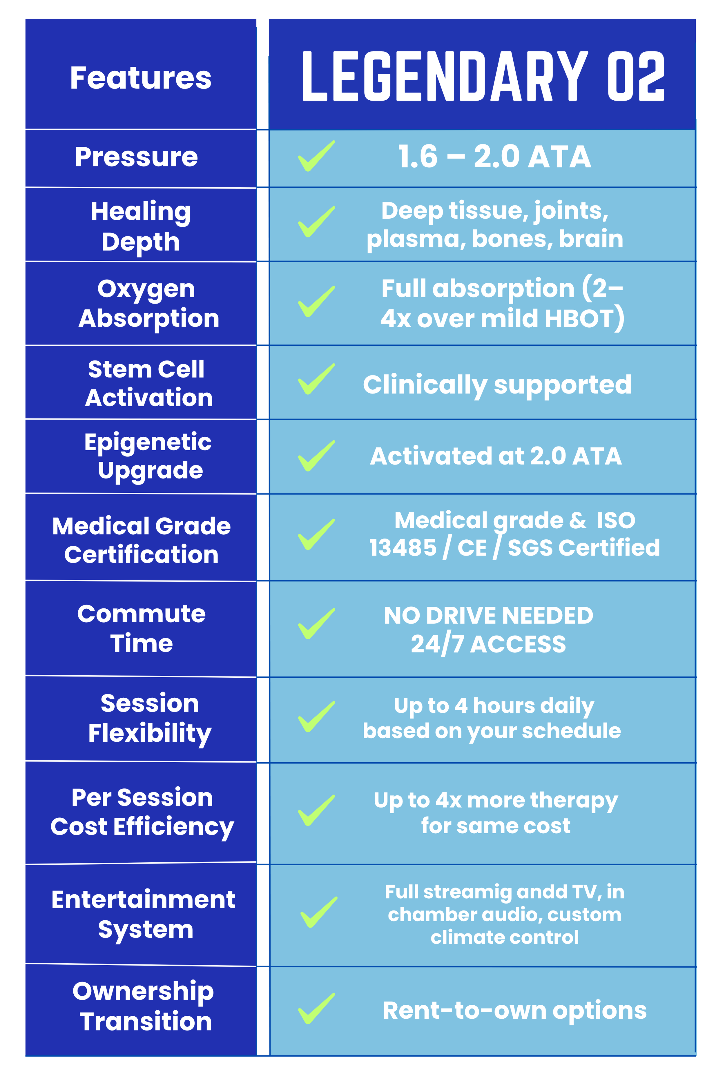At Legendary O₂, we deliver more than therapy — we deliver transformation. Our medical-grade, high-pressure, hard-shell chambers create an environment where true biological change happens — up to 2.0 ATA without ever setting foot in a clinic.