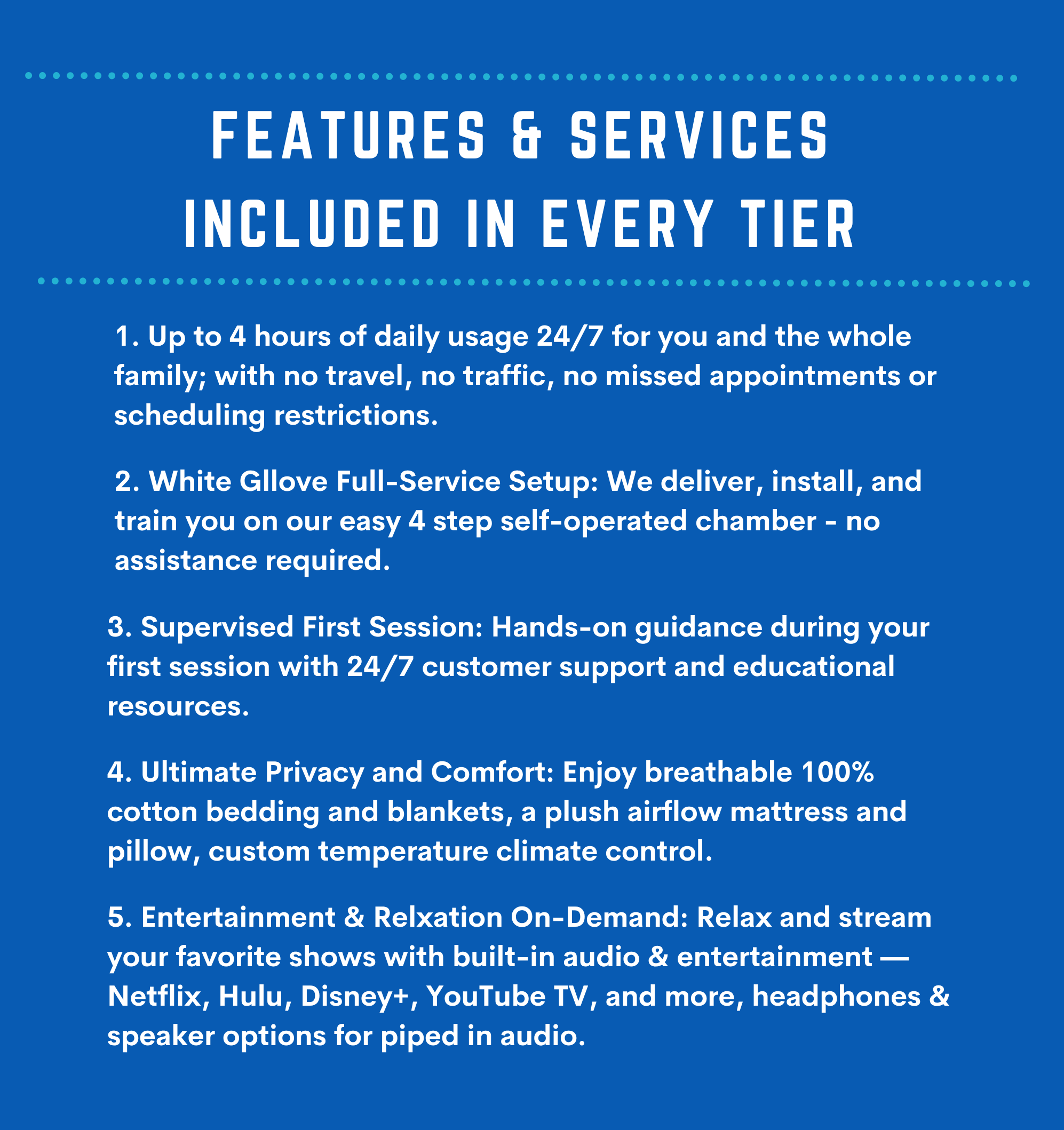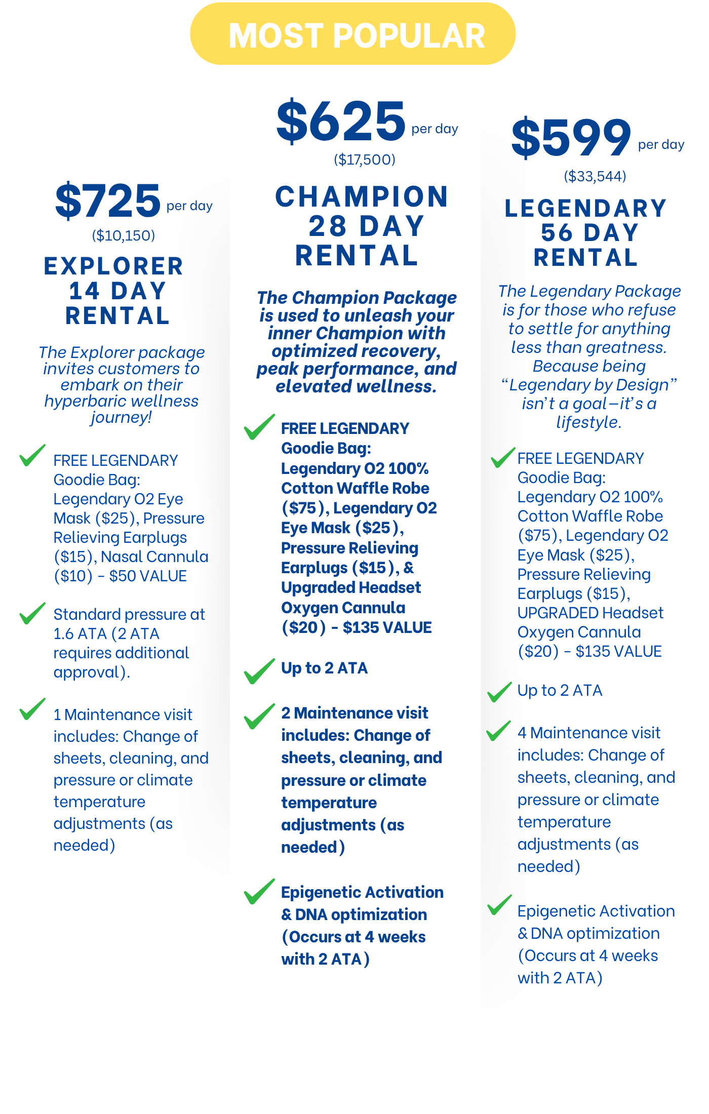 All sessions and chamber rental packages have been provided for the consideration of you purchasing a chamber. Orders normally take 45 - 60 days, which is why we suggest booking a 2 month rental until your unit comes in. And once your apart of our family, we are always here to help you with all your needs to keep it clean and operating at maximum capacity. We provide on going customer service plans to keep you and your chamber in peak performance along educational resources to make your experience owning as easy, effortless, and as comfortable as possible!