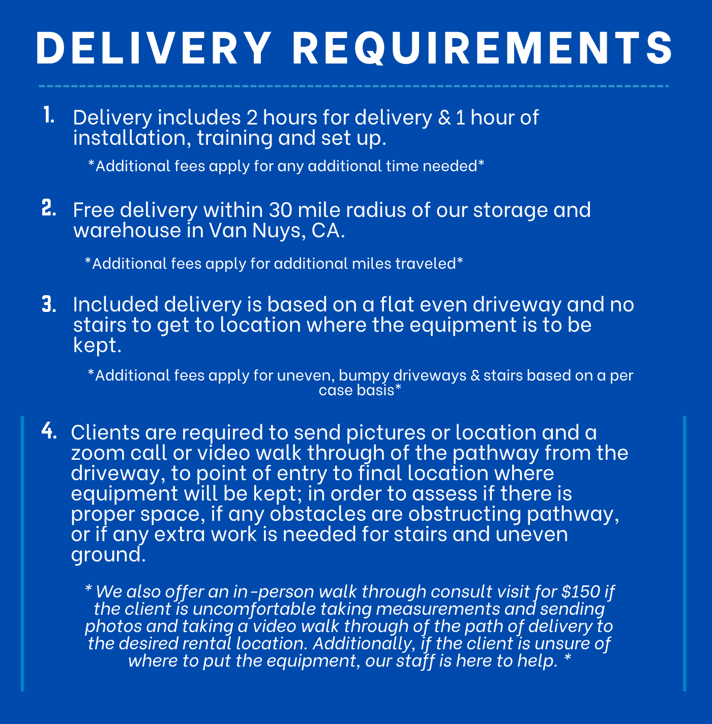 Equipment requires direct access to 4 wall power outlets. (Generators available upon request)